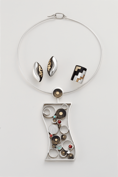 Ms. Kobayakawa specializes in silver jewelry and small ornaments for the home. She combines modern silver designs with traditional apanese materials such as Urushi lacquer and